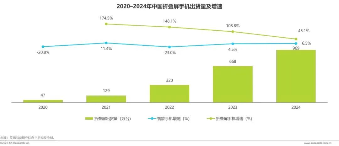 当手机的颜色、材质都卷到无处可卷,改变手机形态,也是一种增强新鲜感、提振销量的方法。折叠屏手机就提供了另一视角,据艾瑞咨询,2022年-2024年期间,折叠屏出货量均保持高速增长。
